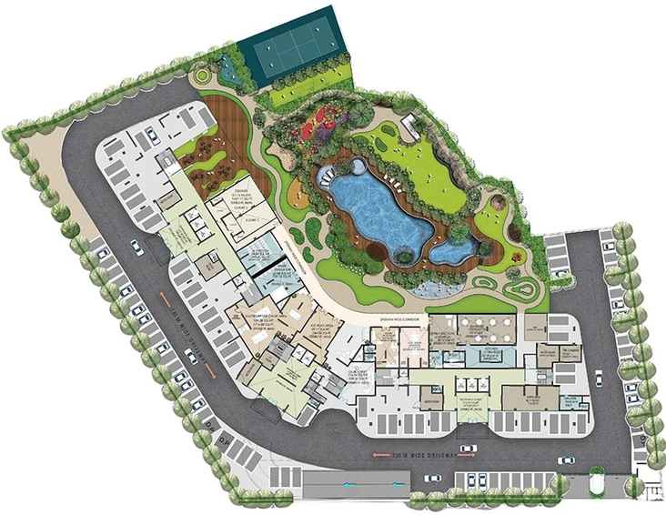 This G+22 floor development spans 2.49 acres and comprises 384 well-designed, spacious apartments. Designed by renowned architect and Padma Bhushan awardee Hafeez Contractor, the layout emphasizes both aesthetics and functionality.
